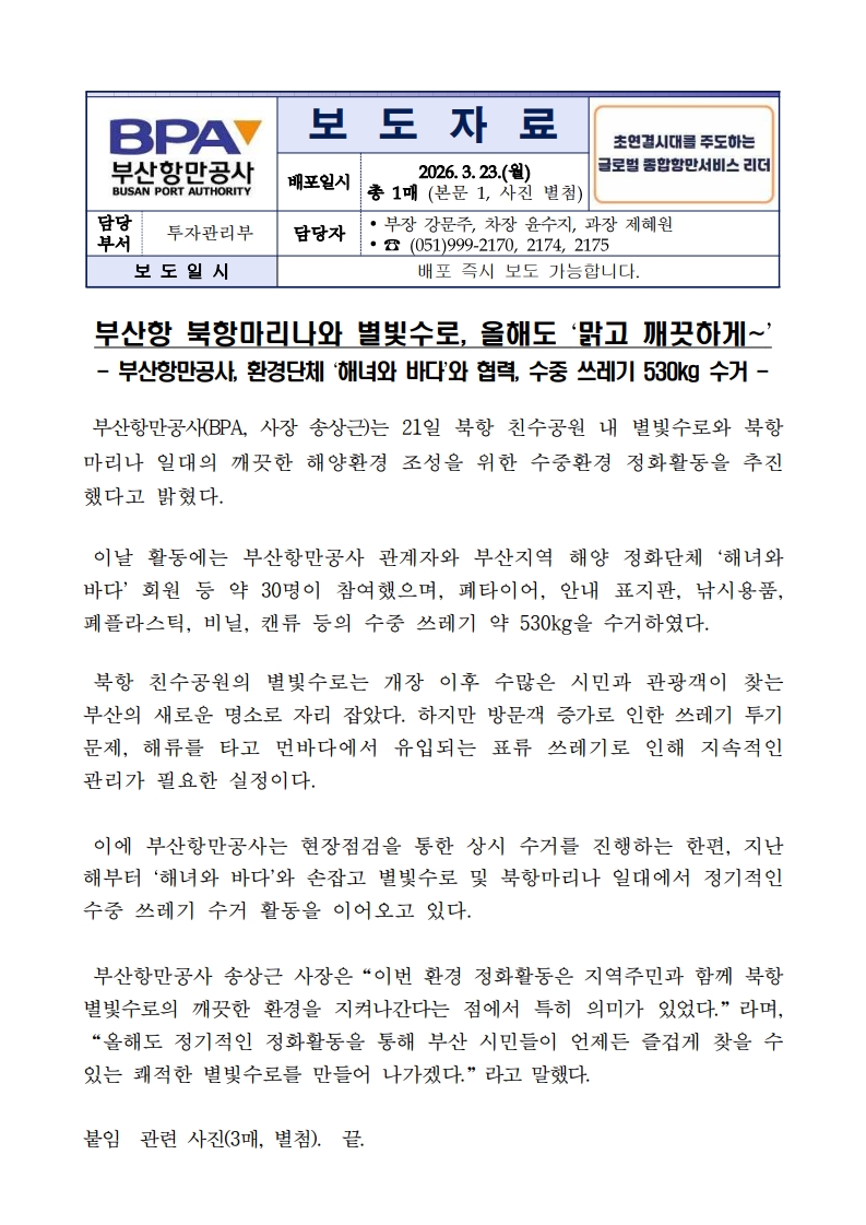 [260323보도자료]BPA,부산항북항마리나와별빛수로,올해도‘맑고깨끗하게’.pdf