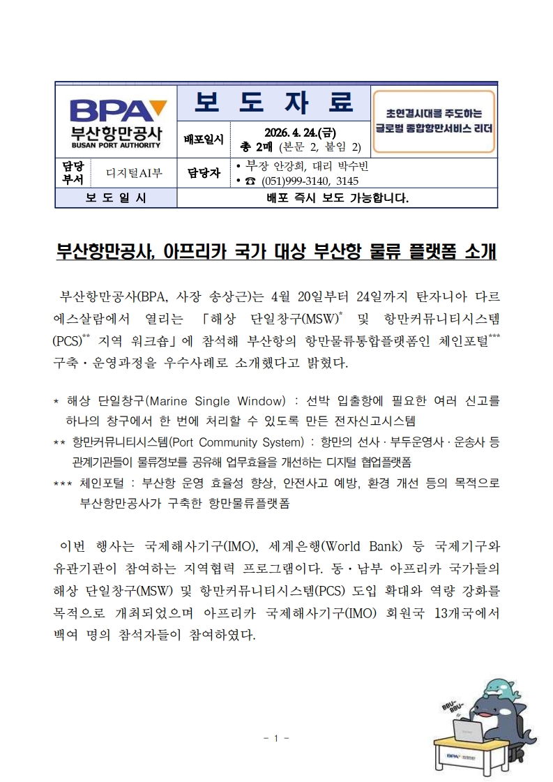 부산항만공사(BPA, 사장 송상근)는 4월 20일부터 24일까지 탄자니아 다르 에스살람에서 열리는 「해상 단일창구(MSW)* 및 항만커뮤니티시스템 (PCS)** 지역 워크숍」에 참석해 부산항의 항만물류통합플랫폼인 체인포털*** 구축·운영과정을 우수사례로 소개했다고 밝혔다. * 해상 단일창구(Marine Single Window) : 선박 입출항에 필요한 여러 신고를 하나의 창구에서 한 번에 처리할 수 있도록 만든 전자신고시스템 ** 항만커뮤니티시스템(Port Community System) : 항만의 선사·부두운영사·운송사 등 관계기관들이 물류정보를 공유해 업무효율을 개선하는 디지털 협업플랫폼 *** 체인포털 : 부산항 운영 효율성 향상, 안전사고 예방, 환경 개선 등의 목적으로 부산항만공사가 구축한 항만물류플랫폼 이번 행사는 국제해사기구(IMO), 세계은행(World Bank) 등 국제기구와 유관기관이 참여하는 지역협력 프로그램이다. 동·남부 아프리카 국가들의 해상 단일창구(MSW) 및 항만커뮤니티시스템(PCS) 도입 확대와 역량 강화를 목적으로 개최되었으며 아프리카 국제해사기구(IMO) 회원국 13개국에서 백여 명의 참석자들이 참여하였다. 부산항만공사의 체인포털은 2023년 세계은행과 국제항만협회가 공동 발간한 보고서에서 동북아 지역 우수 항만 커뮤니티시스템으로 소개된 바 있으며, 이번 워크숍 참여는 세계은행의 공식 초청을 받아 이루어졌다. 부산항만공사는 현지시간 23일, 항만커뮤니티시스템(PCS) 구축 사례발표 세션에서 부산항의 디지털 전환 경과와 체인포털의 주요 기능, 운영성과를 소개하였다. 특히 체인포털은 선사·부두운영사·운송사·화물차운전자 등 항만을 이용하는 이해관계자들을 연결하고 업무효율을 높이는 현장 밀착형 플랫폼임을 강조하였다. 워크숍 참가자들은 부산항 체인포털의 사례가 항만운영 주체 간 협업체계, 데이터 연계, 현장중심의 서비스 개선을 통한 실질적 운영성과를 창출한 점에 주목하며 높은 관심을 보였다. 단일 해상창구(MSW) 및 항만커뮤니티 시스템(PCS) 도입을 검토하는 개발도상국 항만들에게 부산항의 체인포털 운영경험 공유는 실질적인 도움이 되는 참고사례가 될 것으로 기대된다. 부산항만공사 송상근 사장은“부산항의 독자적인 항만커뮤니티시스템 (PCS) 구축 사례가 국제사회에 공유될 수 있어 기쁘게 생각한다.”라며, “참여자들 간 소통을 통해 아프리카 국가들의 항만 디지털화 수요와 제도· 기술적 애로사항을 파악하고, 향후 국제기구 및 항만당국과의 협력 등 디지털 협력 확대를 추진해 나가겠다.”라고 밝혔다.