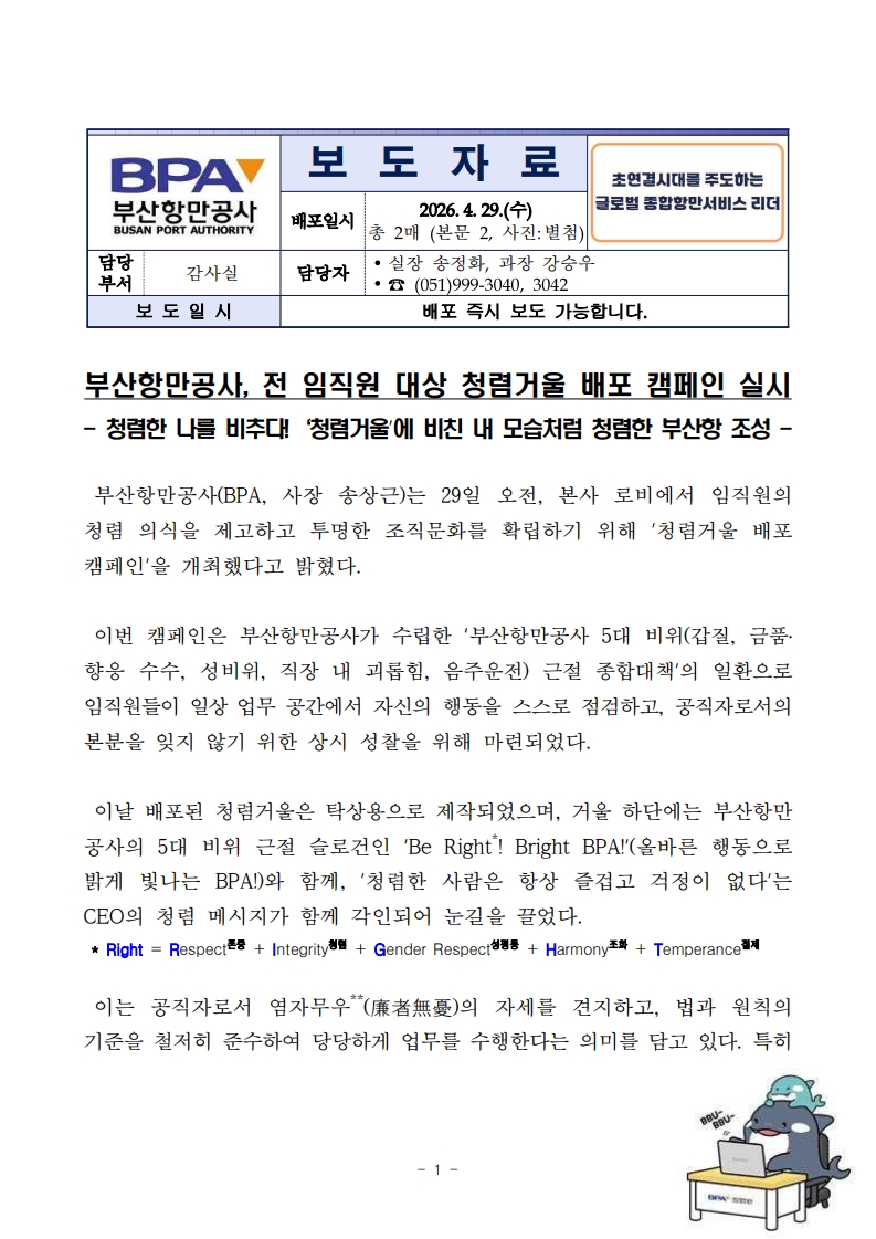부산항만공사(BPA, 사장 송상근)는 29일 오전, 본사 로비에서 임직원의 청렴 의식을 제고하고 투명한 조직문화를 확립하기 위해 ’청렴거울 배포 캠페인’을 개최했다고 밝혔다. 이번 캠페인은 부산항만공사가 수립한 ‘부산항만공사 5대 비위(갑질, 금품· 향응 수수, 성비위, 직장 내 괴롭힘, 음주운전) 근절 종합대책’의 일환으로 임직원들이 일상 업무 공간에서 자신의 행동을 스스로 점검하고, 공직자로서의 본분을 잊지 않기 위한 상시 성찰을 위해 마련되었다. 이날 배포된 청렴거울은 탁상용으로 제작되었으며, 거울 하단에는 부산항만 공사의 5대 비위 근절 슬로건인 ’Be Right*! Bright BPA!’(올바른 행동으로 밝게 빛나는 BPA!)와 함께, ’청렴한 사람은 항상 즐겁고 걱정이 없다’는 CEO의 청렴 메시지가 함께 각인되어 눈길을 끌었다. * Right = Respect존중 + Integrity청렴 + Gender Respect성평등 + Harmony조화 + Temperance절제 이는 공직자로서 염자무우**(廉者無憂)의 자세를 견지하고, 법과 원칙의 기준을 철저히 준수하여 당당하게 업무를 수행한다는 의미를 담고 있다. 특히 부패를 멀리하고 청렴을 실천하는 것이 공직자 개인에게는 마음의 평온을 주고 나아가 업무의 즐거움과 자긍심으로 이어진다는 점을 강조했다. ** 염자무우(廉者無憂) : 청렴한 자는 근심이 없다. 부산항만공사 송상근 사장은 “청렴은 거울처럼 투명하게 우리 자신을 비출때 비로소 완성되는 가치”라며, “모든 임직원이 매일 아침 자신을 점검하며 청렴 의지를 다지고, 이를 바탕으로 더 청렴한 조직, 국민에게 신뢰받는 청렴한 부산항만공사를 만들어 나가겠다”라고 밝혔다.
