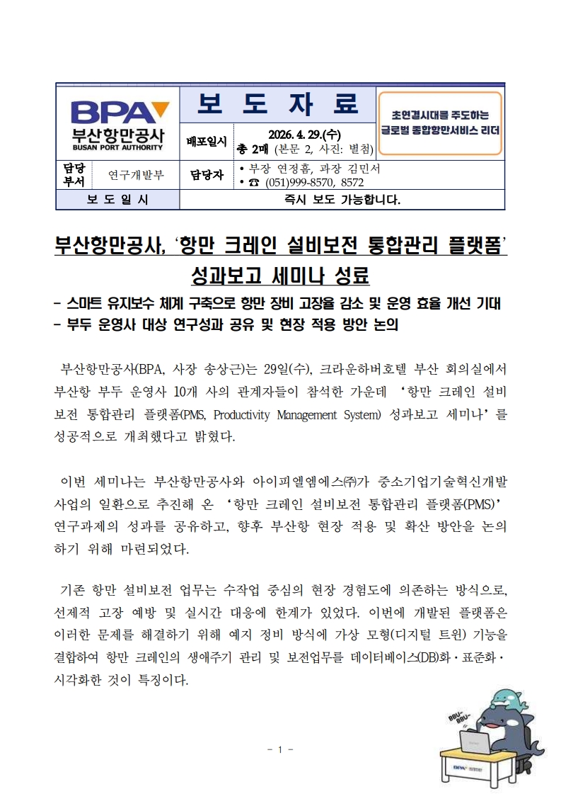[260429 보도자료] 부산항만공사, ‘항만 크레인 설비보전 통합관리 플랫폼(PMS)’ 성과보고 세미나 성료.pdf