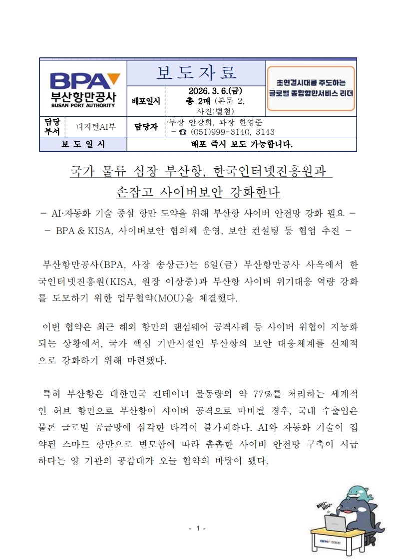 [260306_보도자료] 국가 물류 심장 부산항, 한국인터넷진흥원과 손잡고 사이버보안 강화한다.pdf