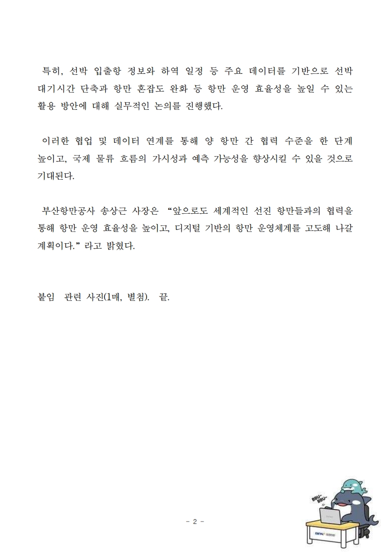 부산항만공사(BPA, 사장 송상근)는 8일(수) 싱가포르를 방문해 싱가포르 해사항만청(MPA, Maritime and Port Authority of Singapore)과 항만 운영 최적화 및 스마트항만 구축을 위한 협력 방안을 논의했다고 밝혔다. 이번 협의는 양 항만의 인공지능 전환(AX)과 디지털 전환(DX)을 가속화하고, 데이터 기반 항만 운영체계 구축을 위한 협력 강화를 목적으로 추진됐다. 부산항만공사는 싱가포르 해사항만청과의 회의에서 항만 운영 데이터의 통합·연계 체계와 실시간 정보 활용 방안에 대해 심도 있게 논의했으며, 특히 싱가포르항의 항만 입출항 최적화(PCO, Port Call Optimization) 시스템 운영 사례를 공유받아 부산항 적용 가능성을 검토했다. 아울러 양 기관은 항만 간 데이터 교환 체계 구축과 디지털 협력 확대 필요성에 공감하고, 실질적인 협력 과제 발굴 및 단계적 협력 추진 방안에 대해 논의했다. 특히, 선박 입출항 정보와 하역 일정 등 주요 데이터를 기반으로 선박 대기시간 단축과 항만 혼잡도 완화 등 항만 운영 효율성을 높일 수 있는 활용 방안에 대해 실무적인 논의를 진행했다. 이러한 협업 및 데이터 연계를 통해 양 항만 간 협력 수준을 한 단계 높이고, 국제 물류 흐름의 가시성과 예측 가능성을 향상시킬 수 있을 것으로 기대된다. 부산항만공사 송상근 사장은 “앞으로도 세계적인 선진 항만들과의 협력을 통해 항만 운영 효율성을 높이고, 디지털 기반의 항만 운영체계를 고도해 나갈 계획이다.”라고 밝혔다.