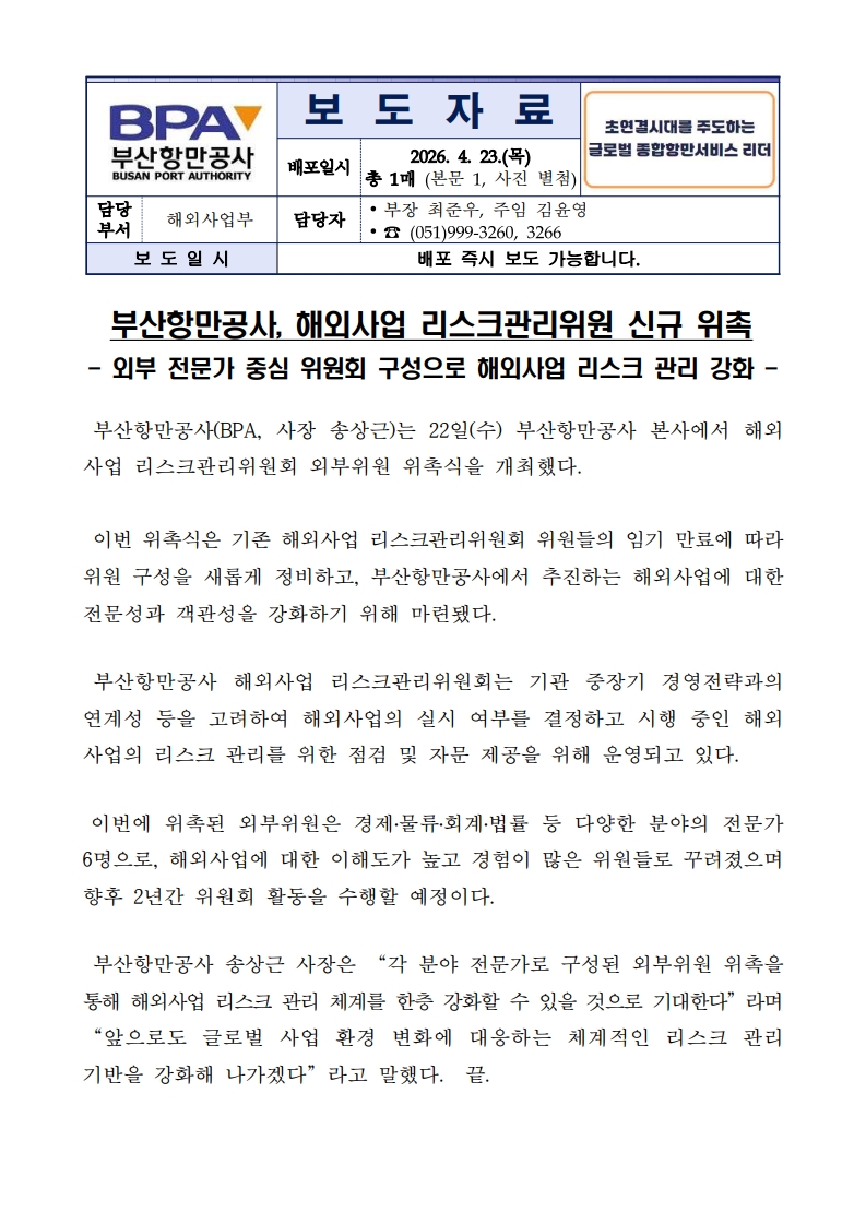 [260423_보도자료] 부산항만공사, 해외사업 리스크관리위원 신규 위촉.pdf