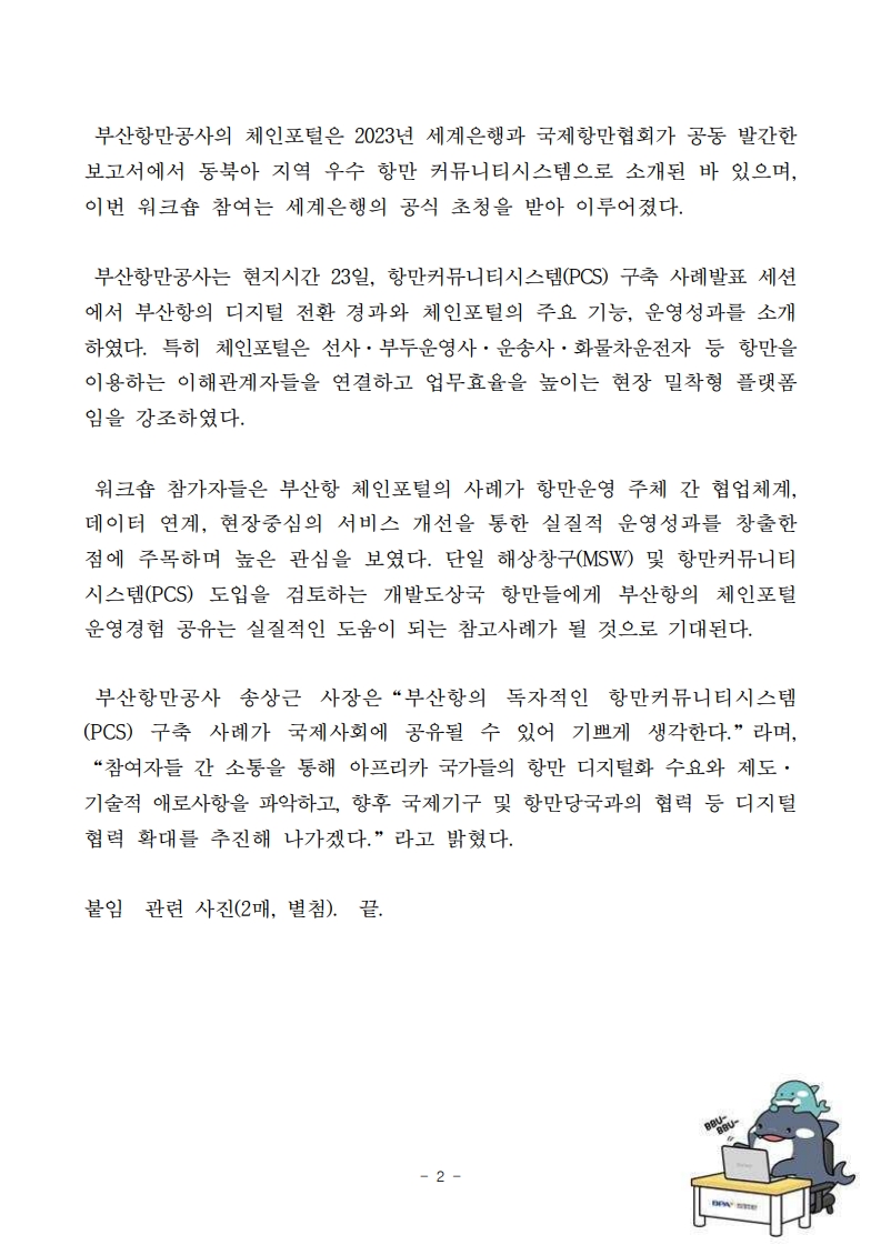 부산항만공사(BPA, 사장 송상근)는 4월 20일부터 24일까지 탄자니아 다르 에스살람에서 열리는 「해상 단일창구(MSW)* 및 항만커뮤니티시스템 (PCS)** 지역 워크숍」에 참석해 부산항의 항만물류통합플랫폼인 체인포털*** 구축·운영과정을 우수사례로 소개했다고 밝혔다. * 해상 단일창구(Marine Single Window) : 선박 입출항에 필요한 여러 신고를 하나의 창구에서 한 번에 처리할 수 있도록 만든 전자신고시스템 ** 항만커뮤니티시스템(Port Community System) : 항만의 선사·부두운영사·운송사 등 관계기관들이 물류정보를 공유해 업무효율을 개선하는 디지털 협업플랫폼 *** 체인포털 : 부산항 운영 효율성 향상, 안전사고 예방, 환경 개선 등의 목적으로 부산항만공사가 구축한 항만물류플랫폼 이번 행사는 국제해사기구(IMO), 세계은행(World Bank) 등 국제기구와 유관기관이 참여하는 지역협력 프로그램이다. 동·남부 아프리카 국가들의 해상 단일창구(MSW) 및 항만커뮤니티시스템(PCS) 도입 확대와 역량 강화를 목적으로 개최되었으며 아프리카 국제해사기구(IMO) 회원국 13개국에서 백여 명의 참석자들이 참여하였다. 부산항만공사의 체인포털은 2023년 세계은행과 국제항만협회가 공동 발간한 보고서에서 동북아 지역 우수 항만 커뮤니티시스템으로 소개된 바 있으며, 이번 워크숍 참여는 세계은행의 공식 초청을 받아 이루어졌다. 부산항만공사는 현지시간 23일, 항만커뮤니티시스템(PCS) 구축 사례발표 세션에서 부산항의 디지털 전환 경과와 체인포털의 주요 기능, 운영성과를 소개하였다. 특히 체인포털은 선사·부두운영사·운송사·화물차운전자 등 항만을 이용하는 이해관계자들을 연결하고 업무효율을 높이는 현장 밀착형 플랫폼임을 강조하였다. 워크숍 참가자들은 부산항 체인포털의 사례가 항만운영 주체 간 협업체계, 데이터 연계, 현장중심의 서비스 개선을 통한 실질적 운영성과를 창출한 점에 주목하며 높은 관심을 보였다. 단일 해상창구(MSW) 및 항만커뮤니티 시스템(PCS) 도입을 검토하는 개발도상국 항만들에게 부산항의 체인포털 운영경험 공유는 실질적인 도움이 되는 참고사례가 될 것으로 기대된다. 부산항만공사 송상근 사장은“부산항의 독자적인 항만커뮤니티시스템 (PCS) 구축 사례가 국제사회에 공유될 수 있어 기쁘게 생각한다.”라며, “참여자들 간 소통을 통해 아프리카 국가들의 항만 디지털화 수요와 제도· 기술적 애로사항을 파악하고, 향후 국제기구 및 항만당국과의 협력 등 디지털 협력 확대를 추진해 나가겠다.”라고 밝혔다.