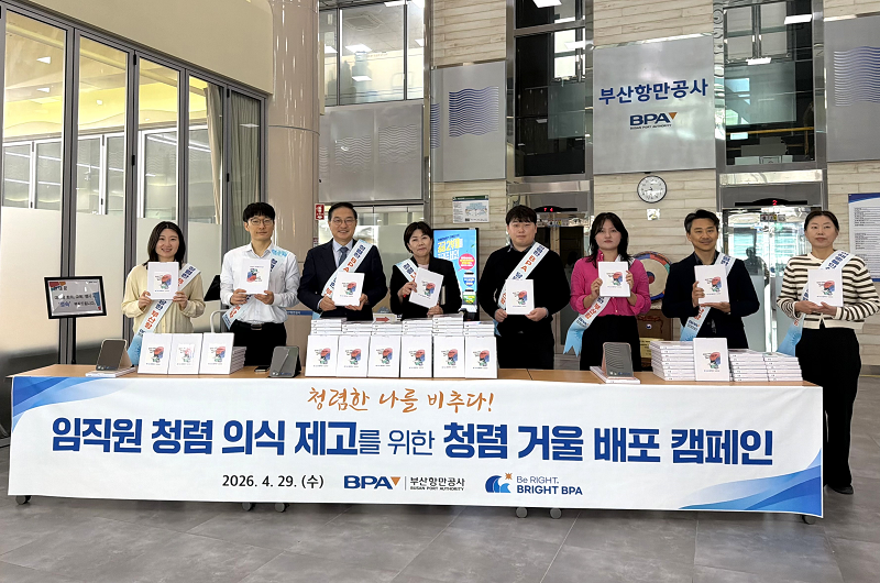 부산항만공사(BPA, 사장 송상근)는 29일 오전, 본사 로비에서 임직원의 청렴 의식을 제고하고 투명한 조직문화를 확립하기 위해 ’청렴거울 배포 캠페인’을 개최했다고 밝혔다. 이번 캠페인은 부산항만공사가 수립한 ‘부산항만공사 5대 비위(갑질, 금품· 향응 수수, 성비위, 직장 내 괴롭힘, 음주운전) 근절 종합대책’의 일환으로 임직원들이 일상 업무 공간에서 자신의 행동을 스스로 점검하고, 공직자로서의 본분을 잊지 않기 위한 상시 성찰을 위해 마련되었다. 이날 배포된 청렴거울은 탁상용으로 제작되었으며, 거울 하단에는 부산항만 공사의 5대 비위 근절 슬로건인 ’Be Right*! Bright BPA!’(올바른 행동으로 밝게 빛나는 BPA!)와 함께, ’청렴한 사람은 항상 즐겁고 걱정이 없다’는 CEO의 청렴 메시지가 함께 각인되어 눈길을 끌었다. * Right = Respect존중 + Integrity청렴 + Gender Respect성평등 + Harmony조화 + Temperance절제 이는 공직자로서 염자무우**(廉者無憂)의 자세를 견지하고, 법과 원칙의 기준을 철저히 준수하여 당당하게 업무를 수행한다는 의미를 담고 있다. 특히 부패를 멀리하고 청렴을 실천하는 것이 공직자 개인에게는 마음의 평온을 주고 나아가 업무의 즐거움과 자긍심으로 이어진다는 점을 강조했다. ** 염자무우(廉者無憂) : 청렴한 자는 근심이 없다. 부산항만공사 송상근 사장은 “청렴은 거울처럼 투명하게 우리 자신을 비출때 비로소 완성되는 가치”라며, “모든 임직원이 매일 아침 자신을 점검하며 청렴 의지를 다지고, 이를 바탕으로 더 청렴한 조직, 국민에게 신뢰받는 청렴한 부산항만공사를 만들어 나가겠다”라고 밝혔다.