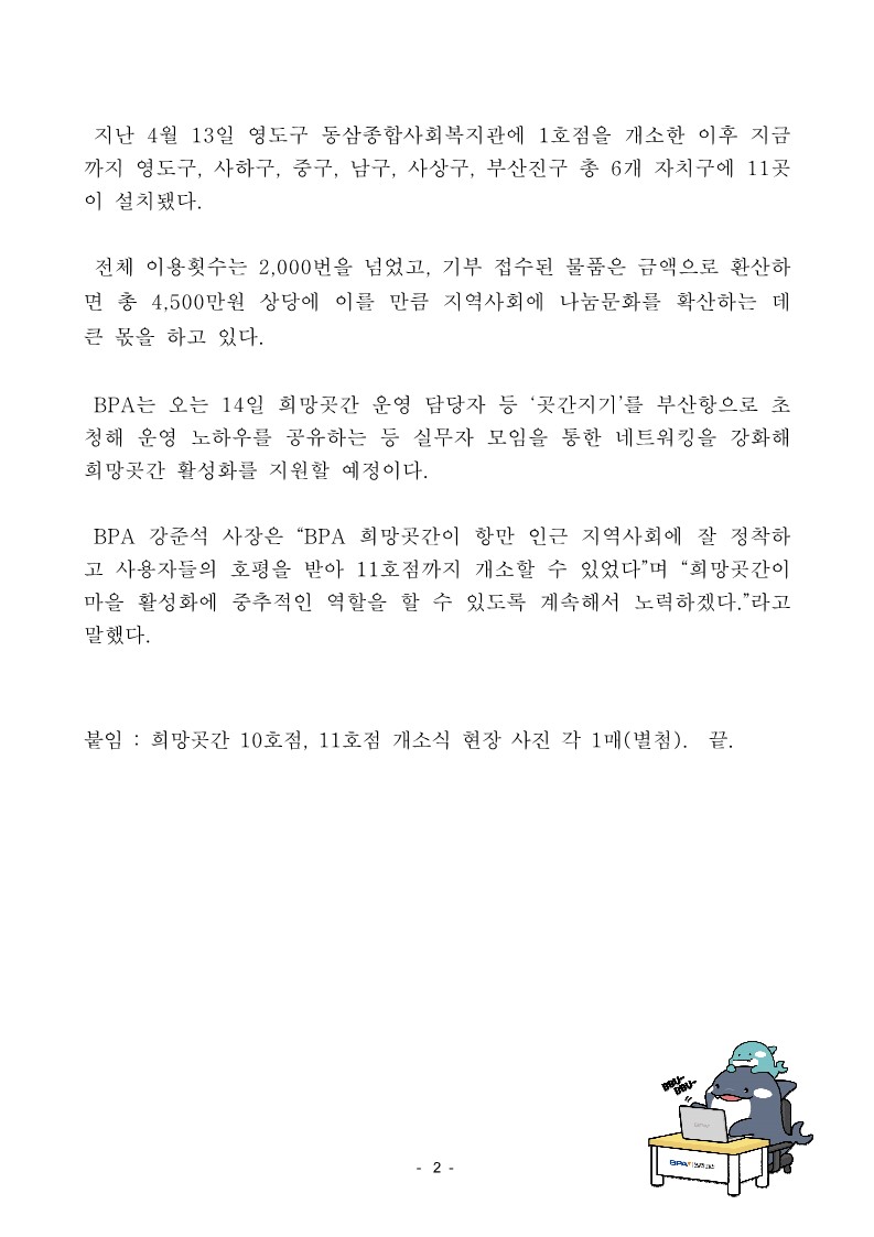 붙임 : 희망곳간 10호점, 11호점 개소식 현장 사진 각 1매(별첨). 끝.