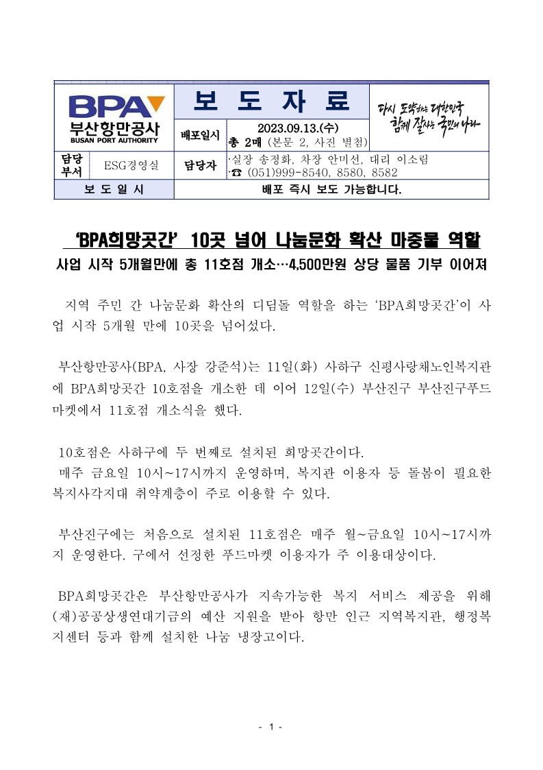 부산항만공사(BPA, 사장 강준석)는 11일(화) 사하구 신평사랑채노인복지관 에 BPA희망곳간 10호점을 개소한 데 이어 12일(수) 부산진구 부산진구푸드 마켓에서 11호점 개소식을 했다.
