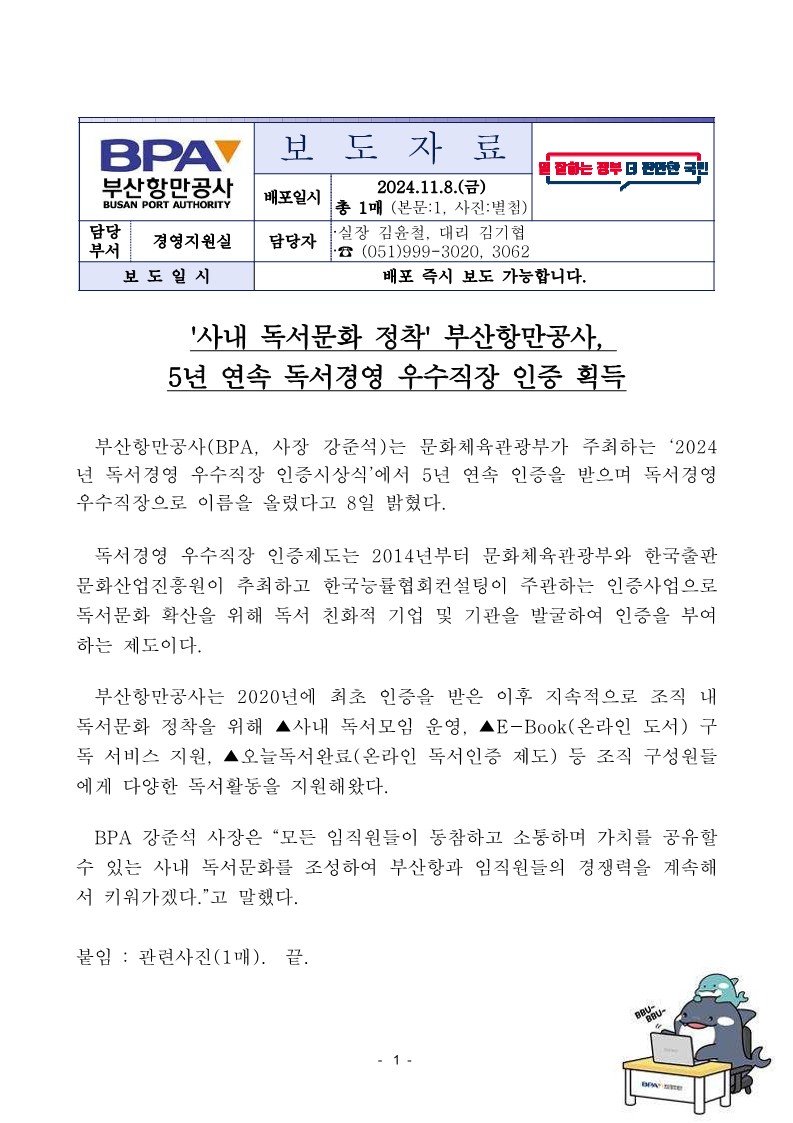 부산항만공사(BPA, 사장 강준석)는 문화체육관광부가 주최하는 '2024년 독서경영 우수직장 인증시상식'에서 5년 연속 인증을 받으며 독서경영 우수직장으로 이름을 올렸다고 8일 밝혔다.
